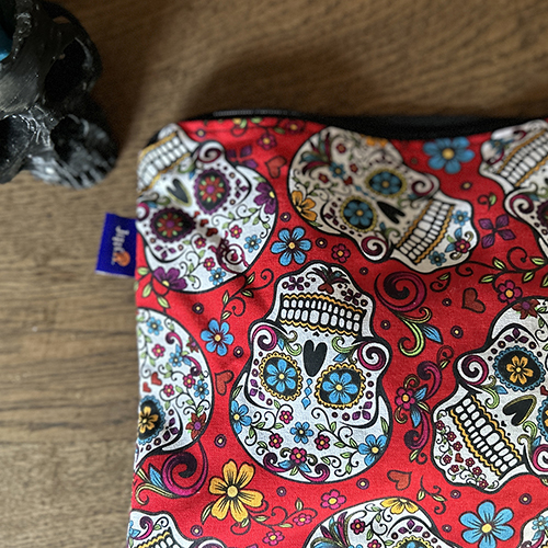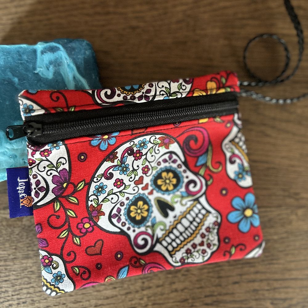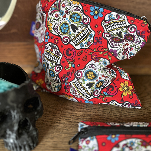 Cheerful cotton toilet bag, red skull. The inside is made of black cotton fabric.