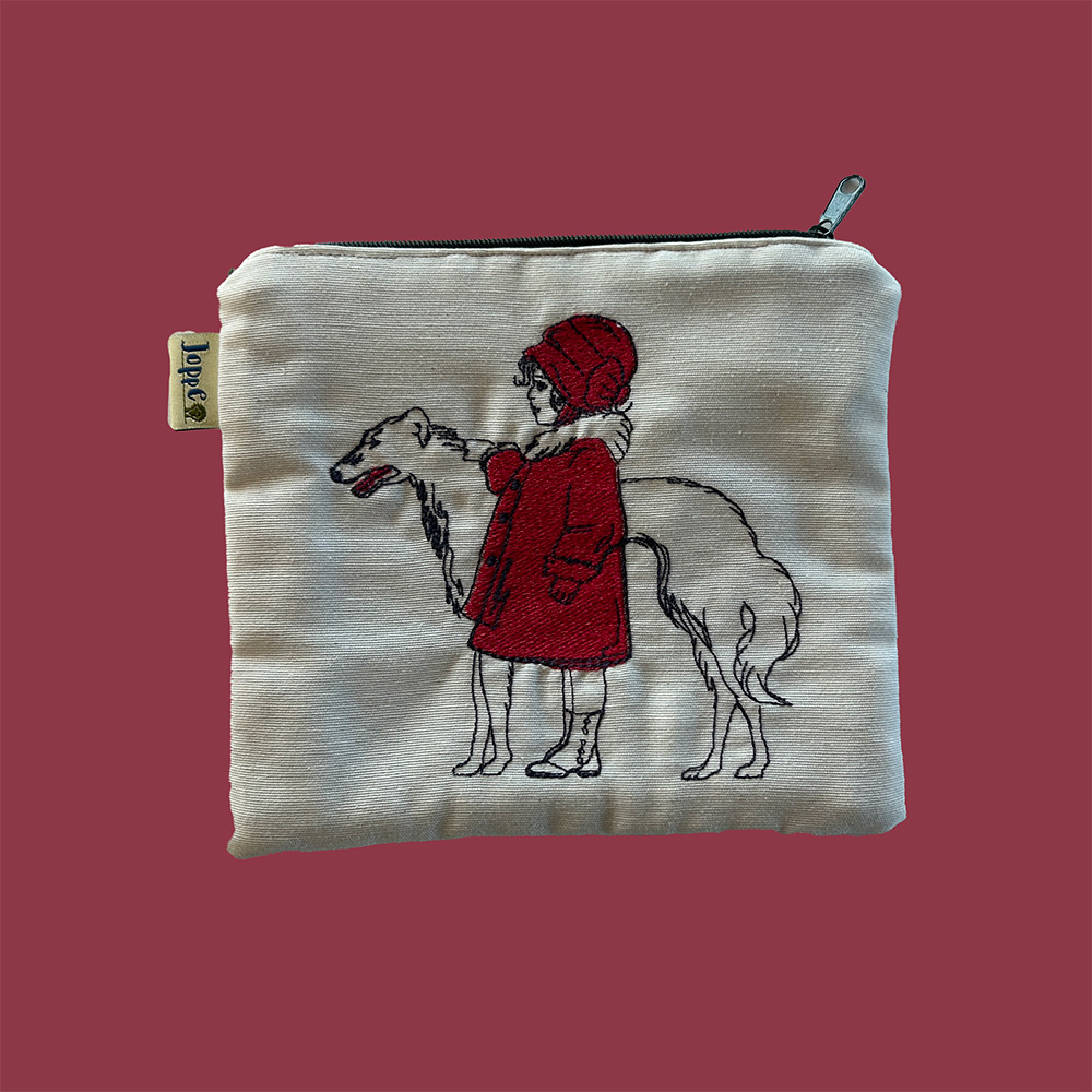 This pretty little bag in ecru has an embroidered girl in a red jacket, together with her Barsoi, in vintage style.