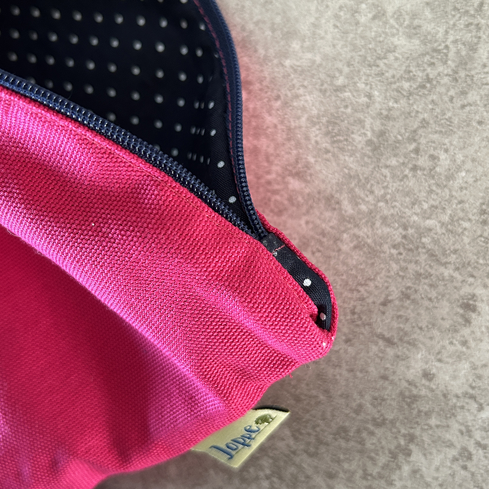 Leuke toilettas met geborduurde teckel, van mooi donker roze stevig katoen. Gevoerd met blauwe stof met wit stipje