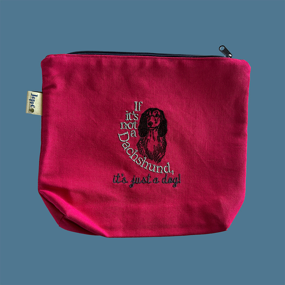 Cute toilet bag with embroidered dachshund, made of sturdy cotton in a beautiful dark pink. Lined with blue fabric with white dots.